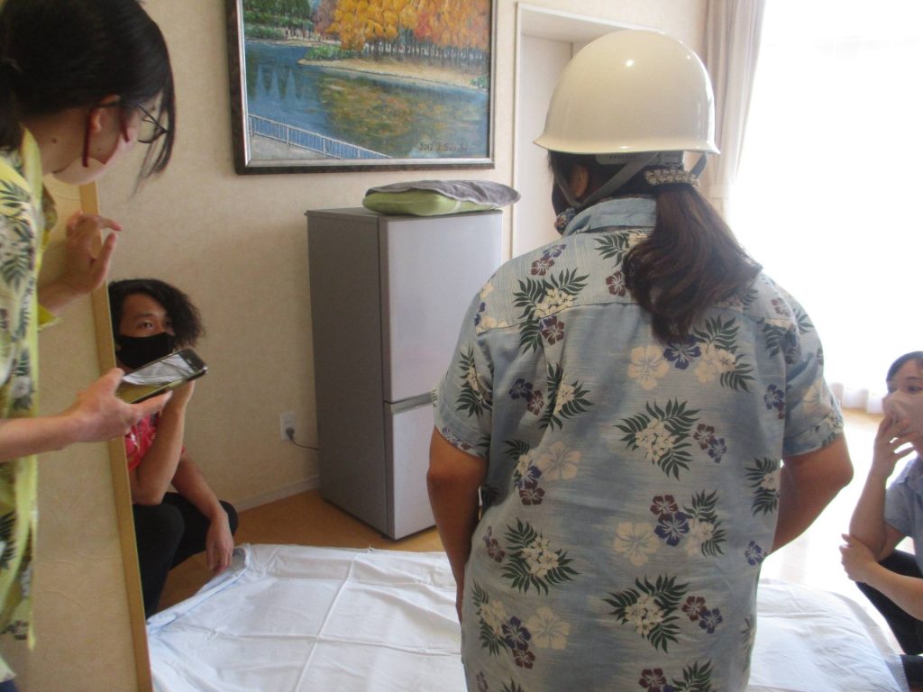 入居者様役のスタッフも安全を第一にヘルメット着用です😤