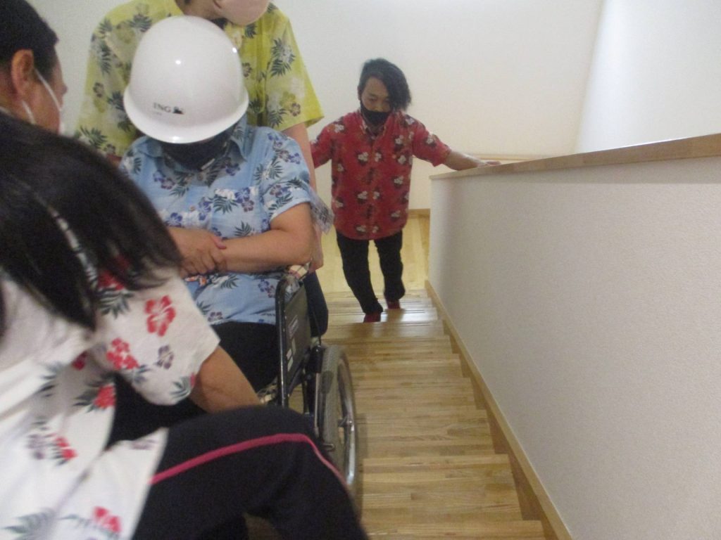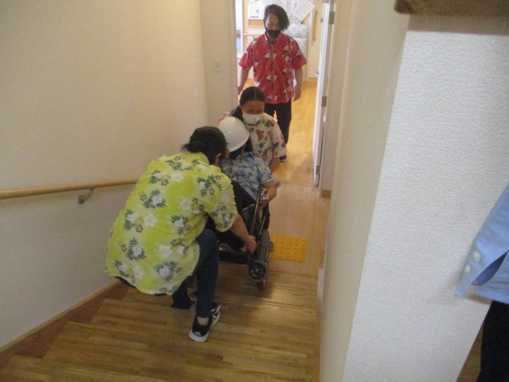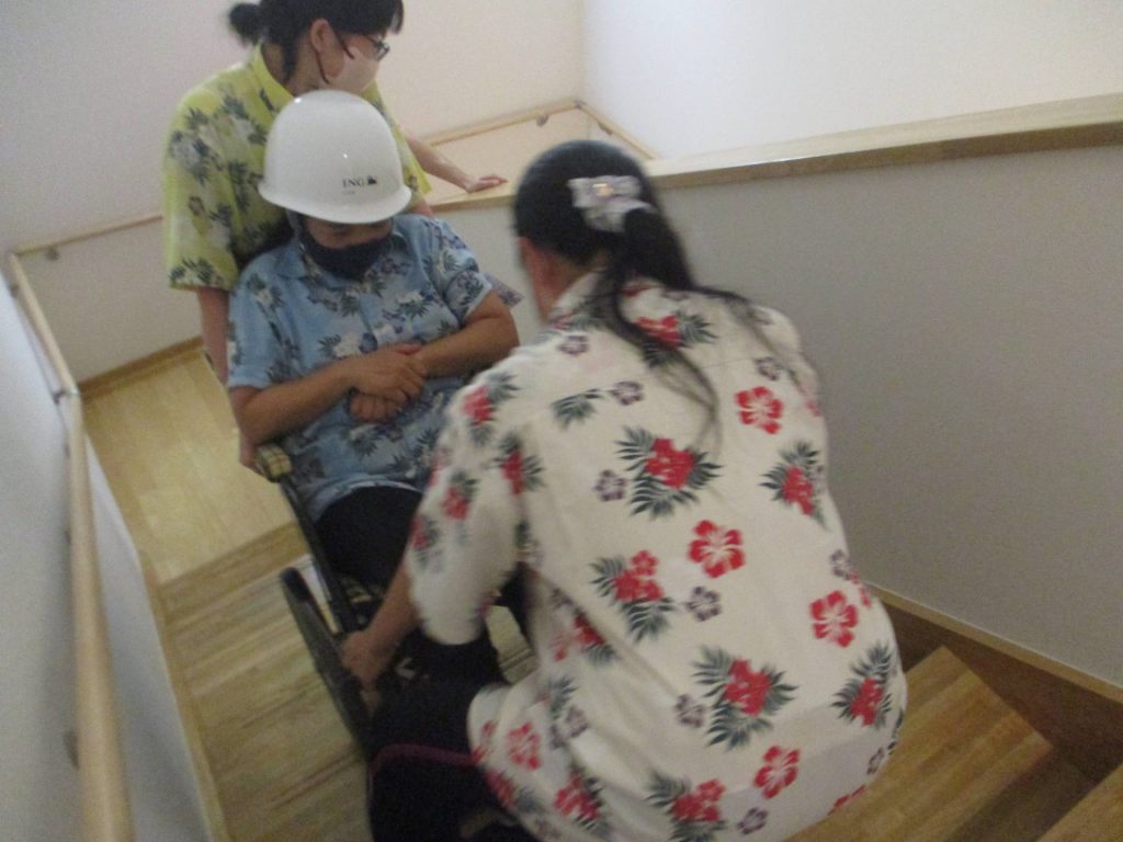 車椅子での誘導は、出来るだけ車輪を持ち上げながら誘導することで、スムーズに1階までの避難を行うことが出来ました🤗